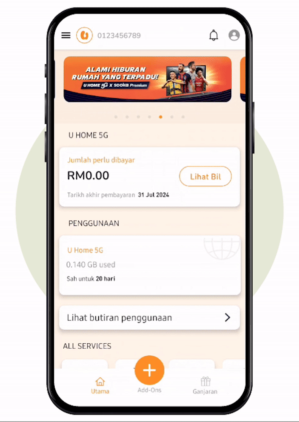 Cari banner 'U Home 5G x sooka Premium' di halaman utama atau cari di bawah Featured Service, kemudian tekan 'Beli Sekarang' untuk meneruskan.