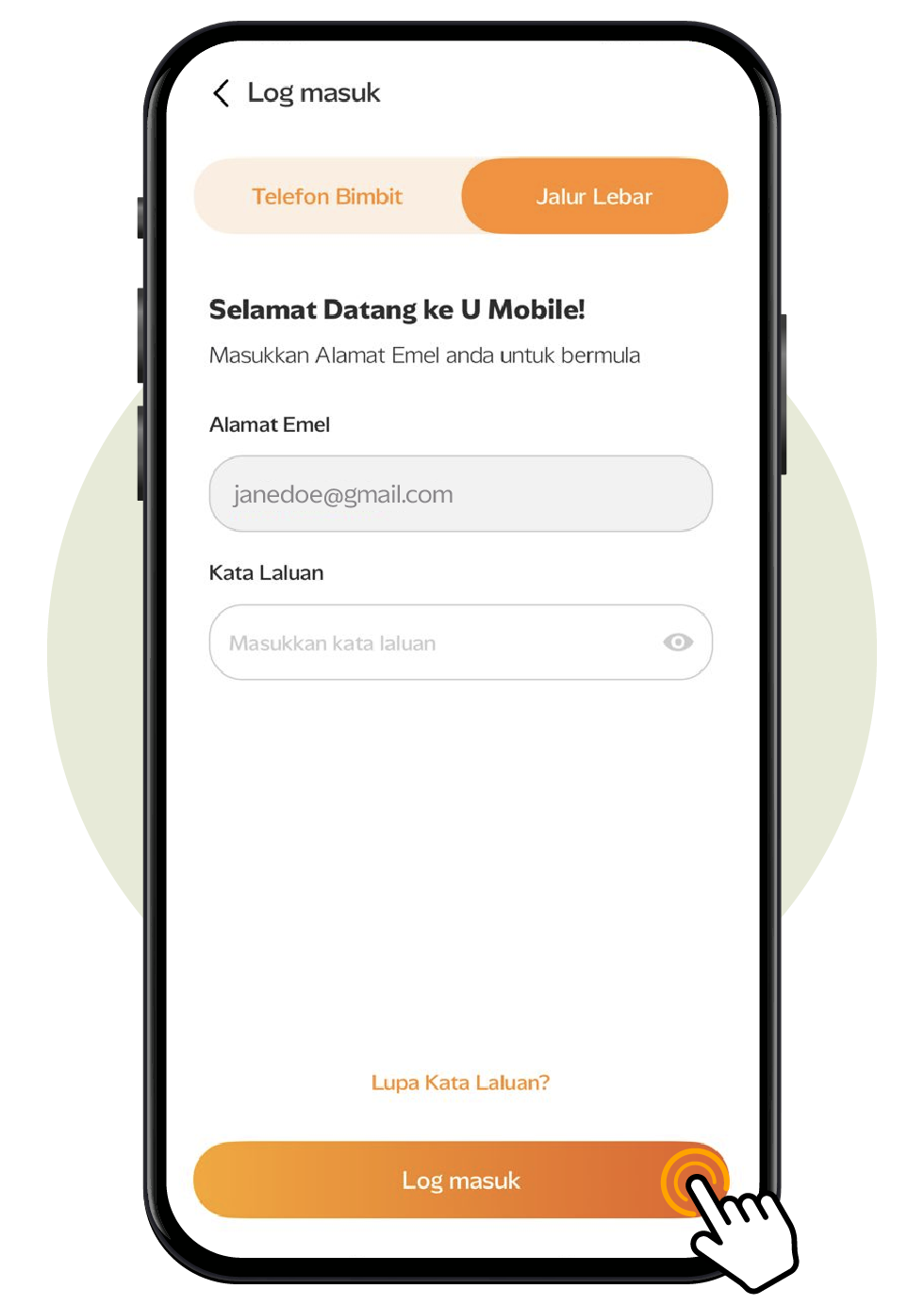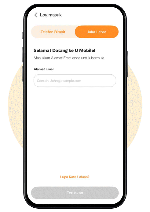 Muat turun dan lancarkan MyUMobile App, klik pada "Jalur Lebar" dan masukkan e-mel dan tetapkan kata laluan pilihan anda. Lengkapkan pengesahan OTP, kemudian klik "Log Masuk".
