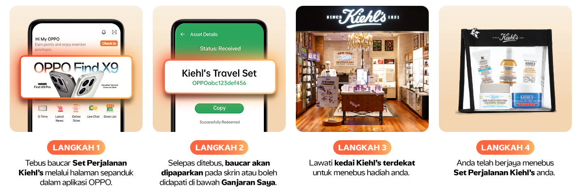 Anda akan menerima pelan perlindungan skrin selama 1 tahun, Kiehl’s Best Sellers Travel Kit, dan E-baucar Kiehl’s bernilai RM50 jika anda membeli mana-mana telefon OPPO Find X9 dari 7 November hingga 7 Disember 2025.
