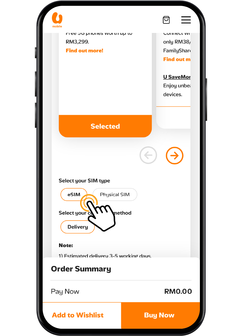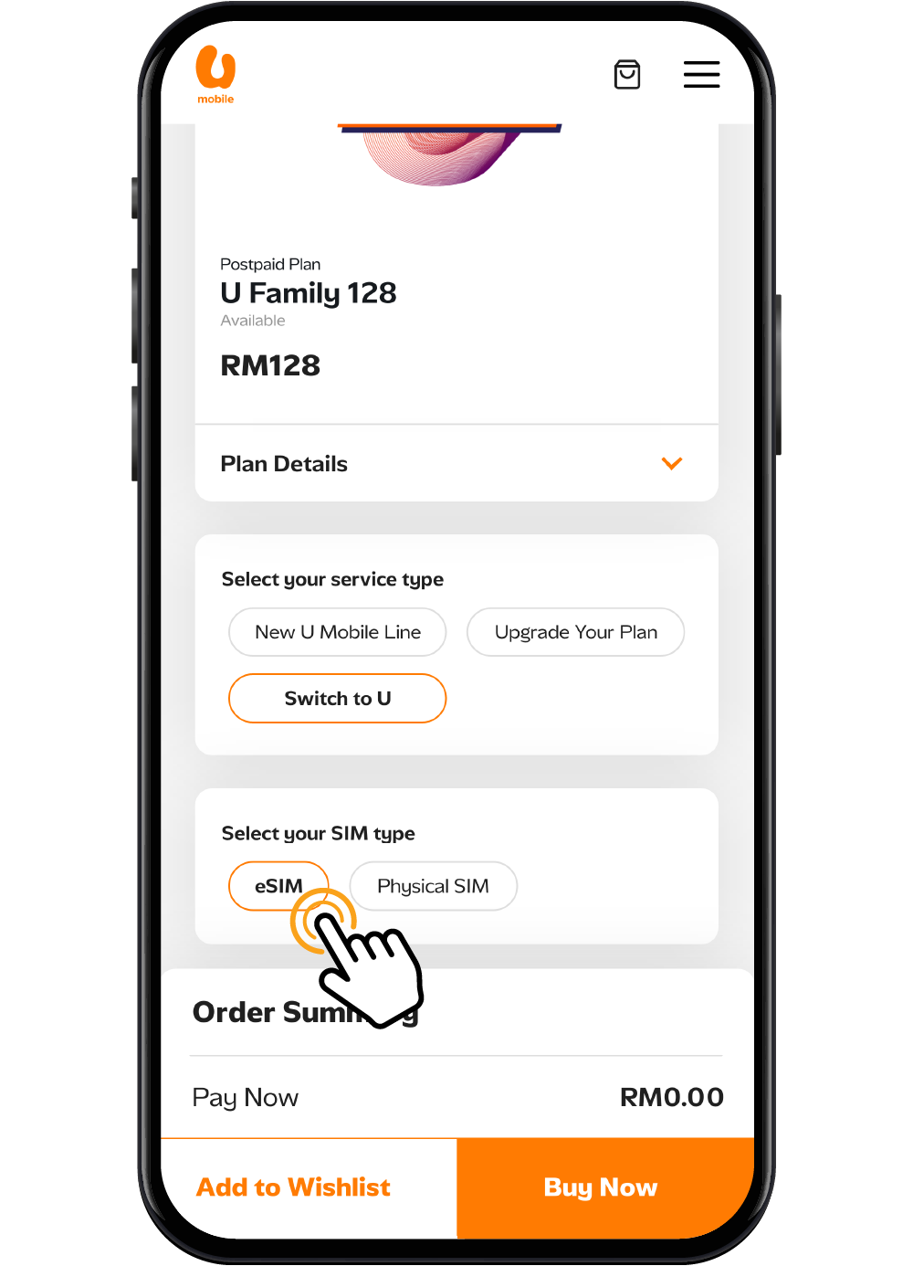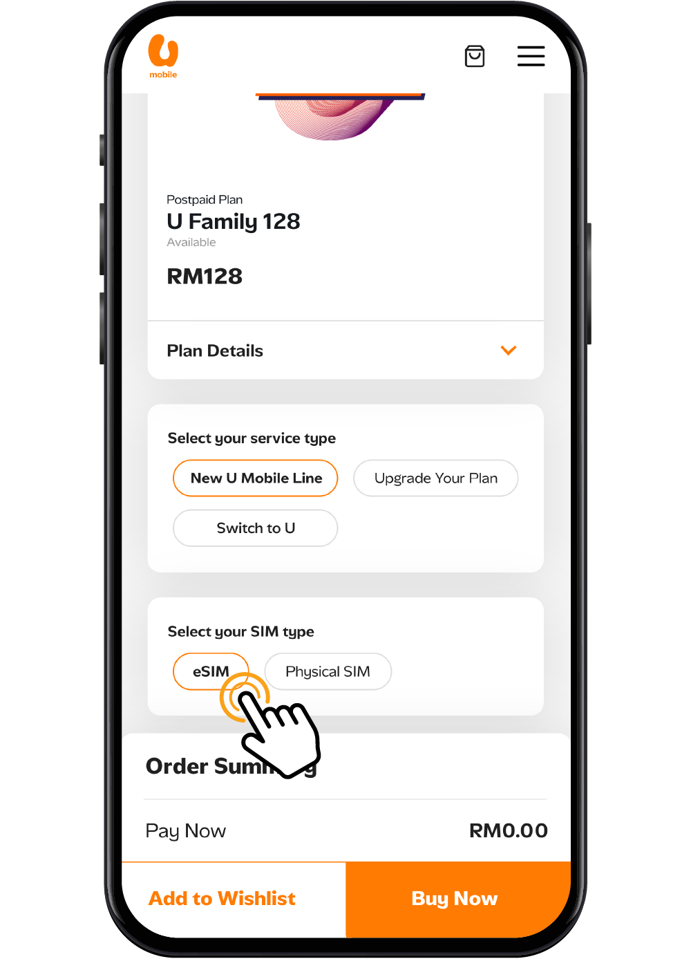 eSIM 是内置在手机里的一种虚拟电话卡芯片,可以下载并安装 U Mobile 的网络档案。您可以像用实体SIM卡一样使用 eSIM 拨打电话、发短信和使用网络数据,方便又灵活。