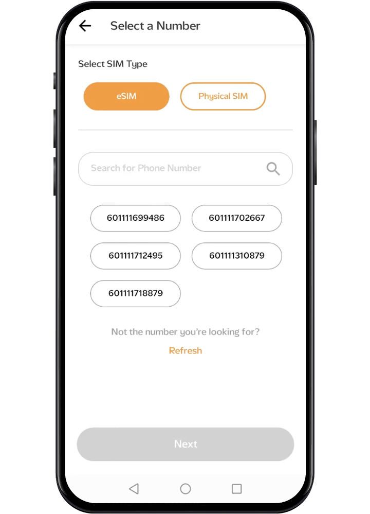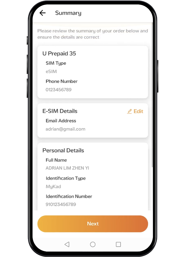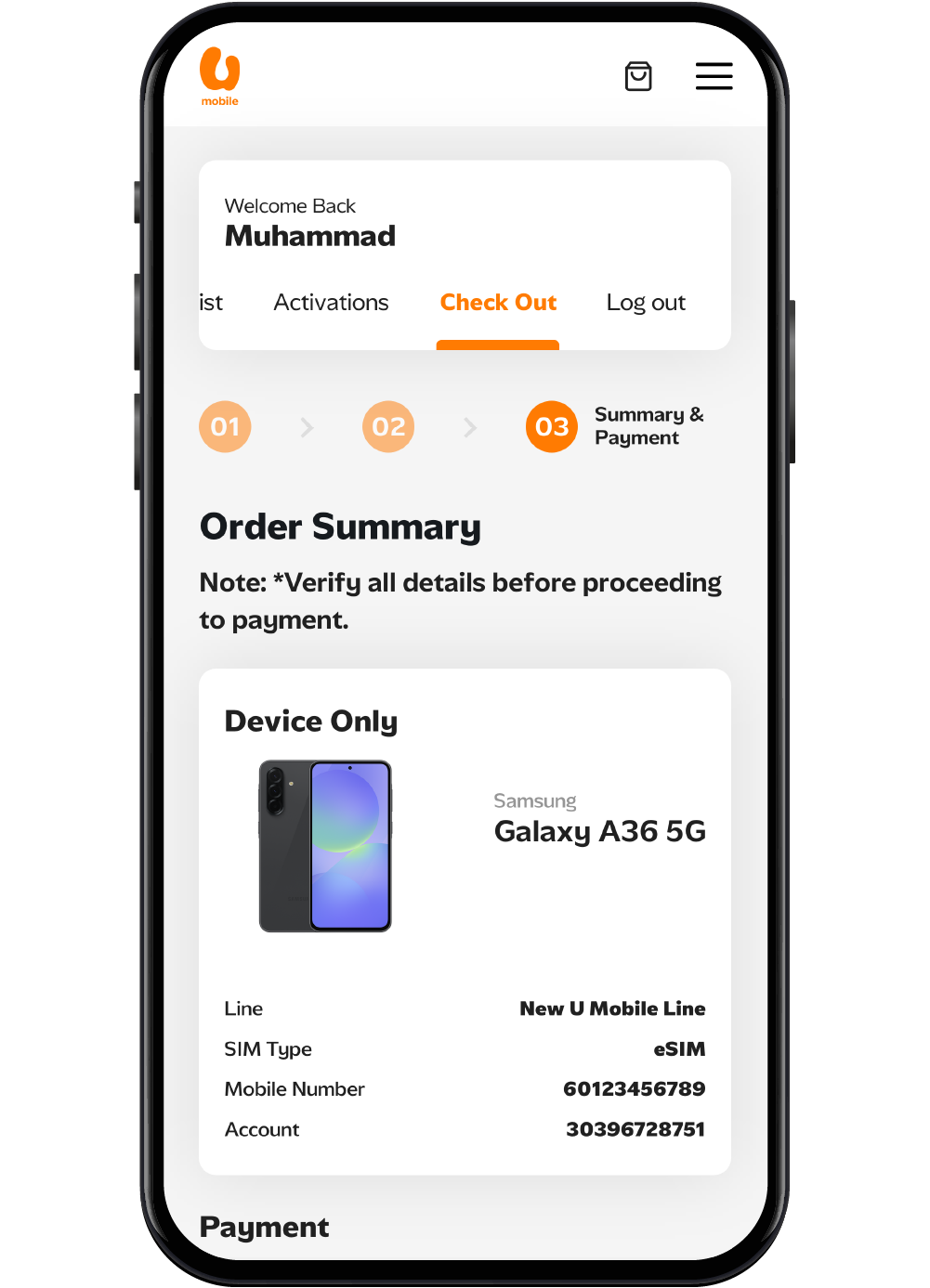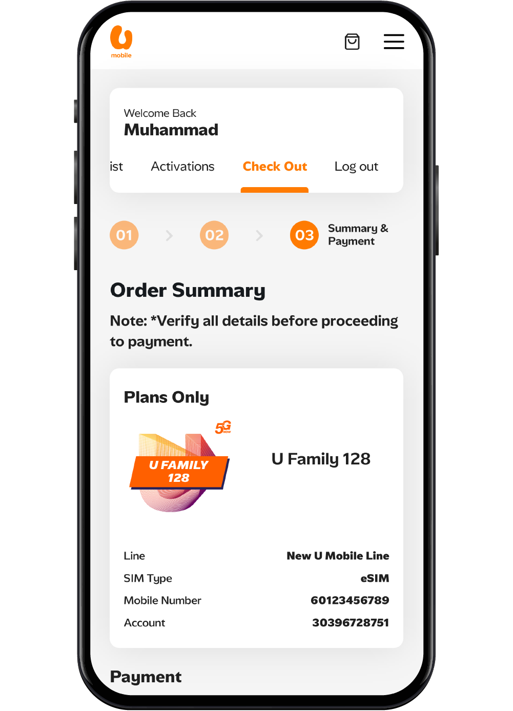 选择您喜爱的手机配套并开始享用U Mobile新专线。使用您的身份证或护照并进行脸部识别来完成eKYC实名验证。