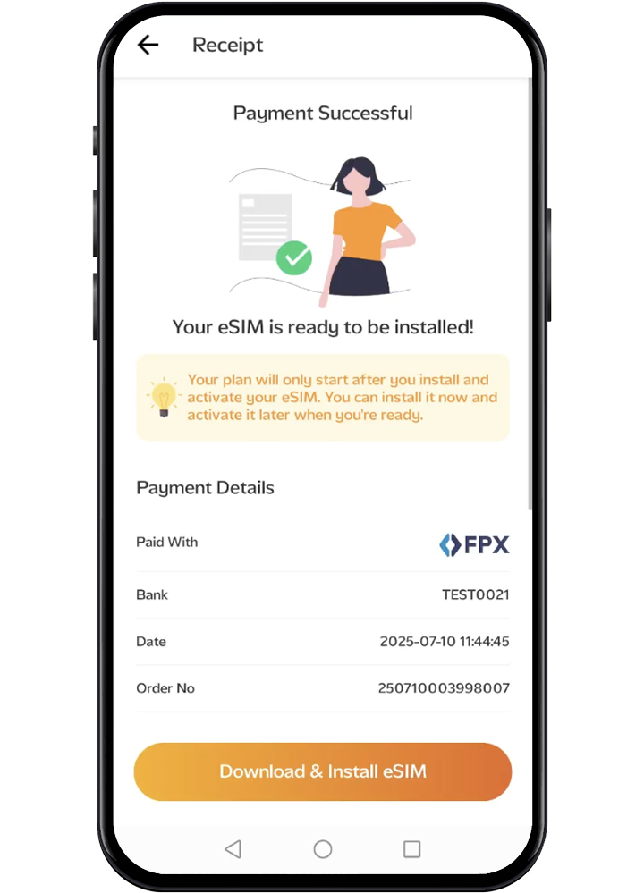 完成付款后,您将收到 eSIM 激活二维码。点击启动 eSIM 以了解如何启用您的新 eSIM。
