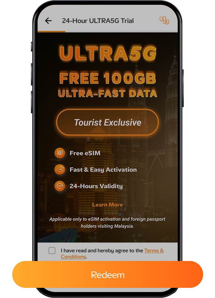 The 24-Hour ULTRA5G Trial is exclusively available to foreign Passport holders visiting Malaysia. Malaysian citizens, as well as MyKad, MyKas, MyPR, or MyTentera holders are not eligible.