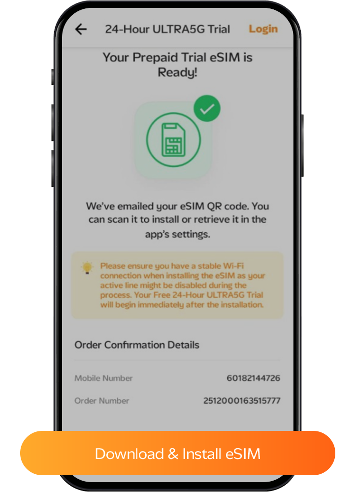 The 24-Hour ULTRA5G Trial is only available in eSIM format and can only be used on eSIM-enabled devices. Please check your phone’s compatibility before activating the eSIM.
