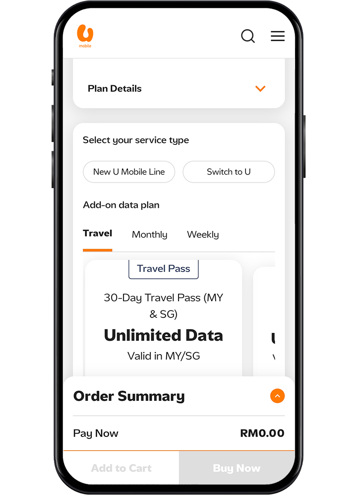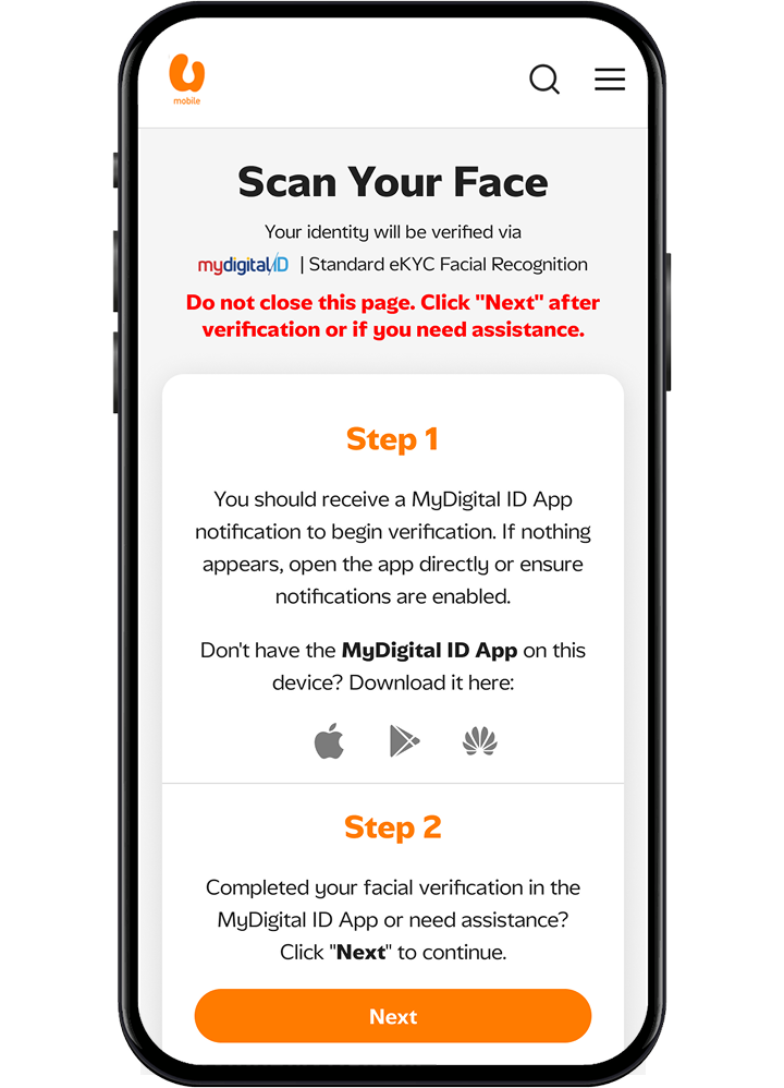 Make your purchase on the U Mobile Online Store. If you already have a MyDigital ID account, you’ll be prompted to continue your verification through the MyDigital ID app.