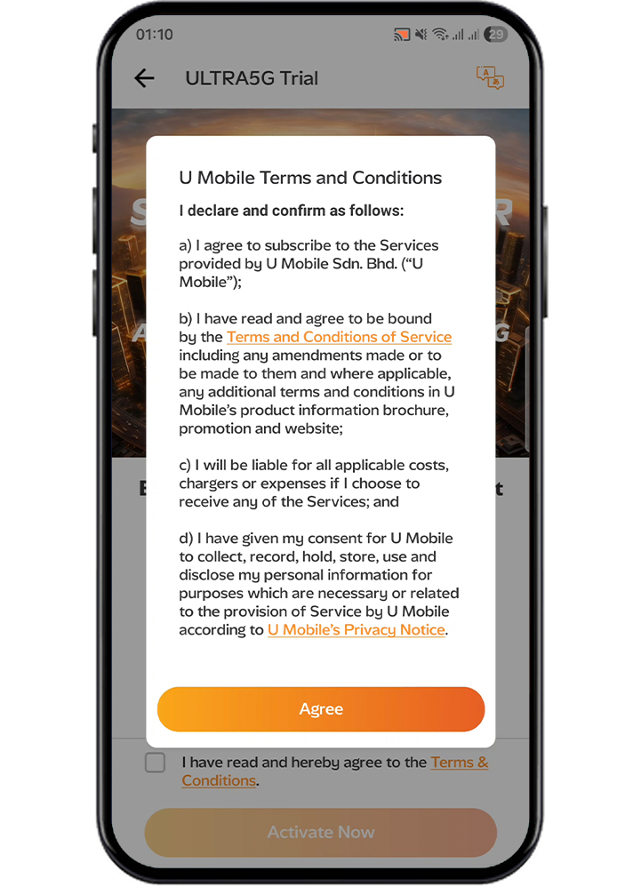 Read and agree to the Terms & Conditions to activate your ULTRA5G Trial. If this page doesn’t appear, click here or scan the QR code to continue.